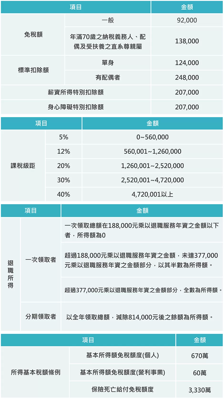 財政部公告112年度綜合所得稅及所得基本稅額相關免稅額、扣除額、課稅級距及計算退職所得定額免稅之金額。