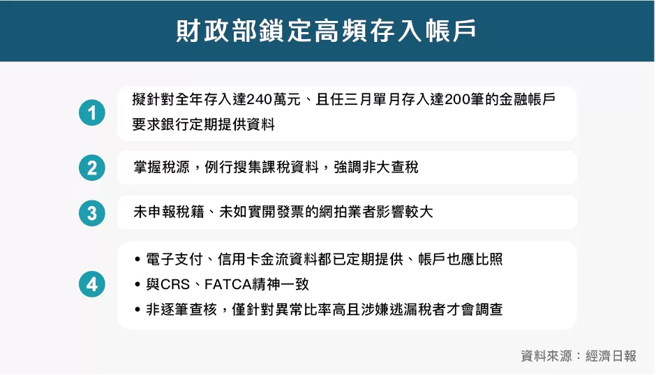財政部盯高頻存入戶,未申報營業稅籍、如實開立統一發票者需注意。