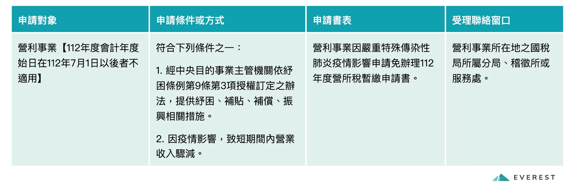 營利事業因疫情影響,於嚴重特殊傳染性肺炎防治及紓困振興特別條例施行期間內(109年1月15日至112年6月30日),符合下列情形之一,可於辦理112年度營所稅暫繳申報期間內,檢具申請書及相關證明文件,向所在地國稅局申請免辦理112年度營所稅暫繳: