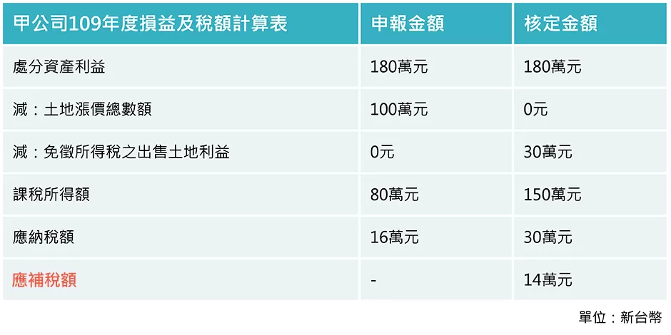 該局說明,甲公司109年度營利事業所得稅結算申報案件,列報處分資產利益180萬元,並減除100萬元之土地漲價總數額。經該局向地政事務所及稅捐稽徵處等單位調閱資料後,甲公司該年度出售2筆土地,其中1筆為同年度買進並賣出之土地,處分資產利益為150萬元、無土地漲價總數額;另1筆為公設地,處分資產利益為30萬元、土地漲價總數額100萬元,因公設地交易所得30萬元免納所得稅,其土地漲價總數額100萬元亦不得扣除,故於免徵所得稅之出售土地利益核定減除30萬元、剔除土地漲價總數額100萬元,並補繳稅款14萬元(如下表)。