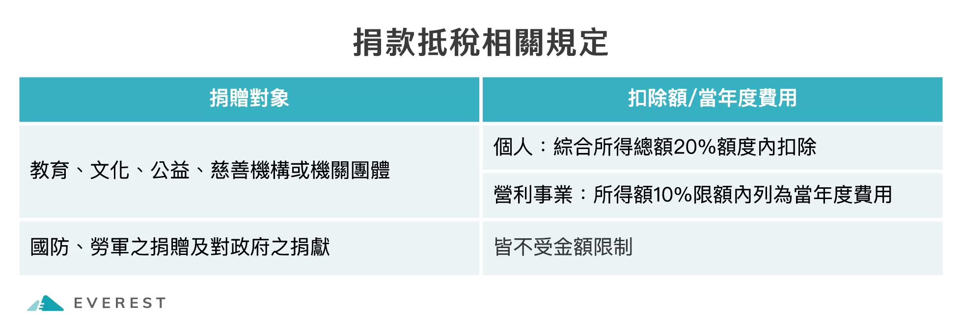 財政部表示,依所得稅法第17條第1項第2款第2目之1規定,個人對於教育、文化、公益、慈善機構或團體(下稱機關團體)之捐贈,得於綜合所得總額20%額度內扣除;但有關國防、勞軍之捐贈及對政府之捐獻,不受金額限制。另依同法第36條規定,營利事業為協助國防建設、慰勞軍隊、對政府之捐贈,及經該部專案核准之捐贈,得列為當年度費用,不受金額限制;對機關團體之捐贈,得在不超過營利事業所得額10%限額內列為當年度費用。